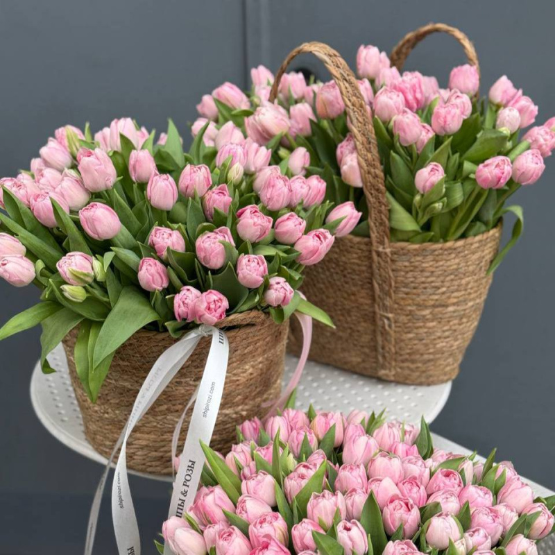 Корзина из 101 пионовидного тюльпана сорта Дриммер.