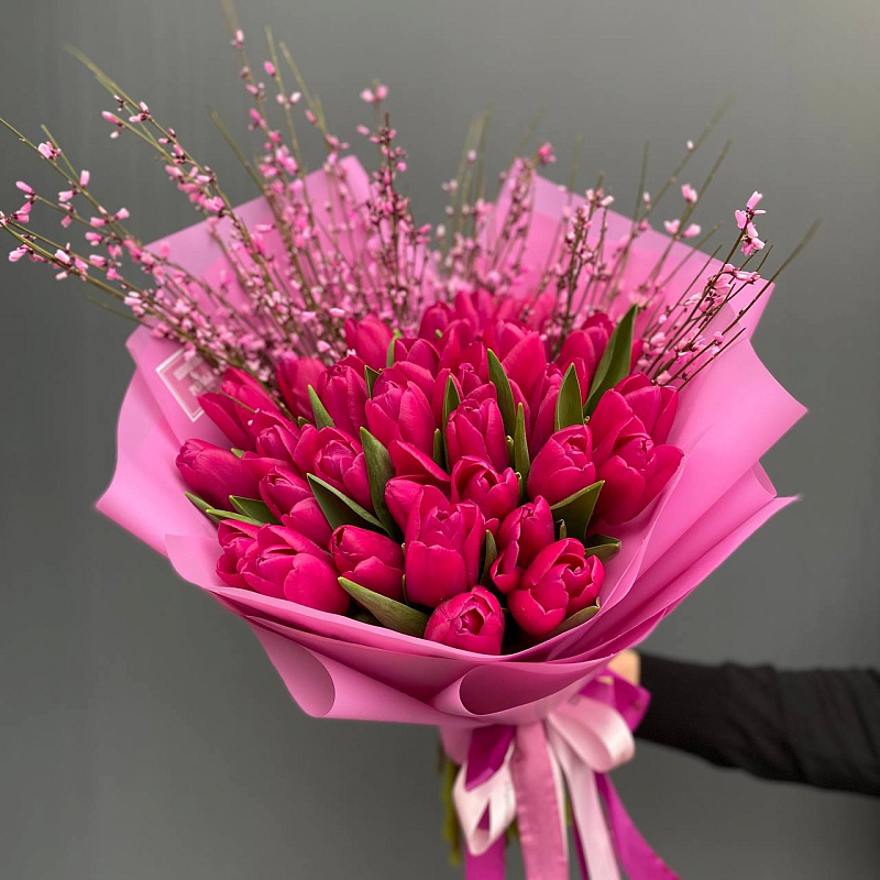 Яркий букет из 31 тюльпана и ароматной генисты.