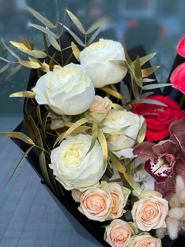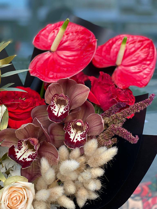 Состав букета: Орхидея , Пионовидные розы , Антуриум ,Эвкалипт , Кустовые розы , Лагурус