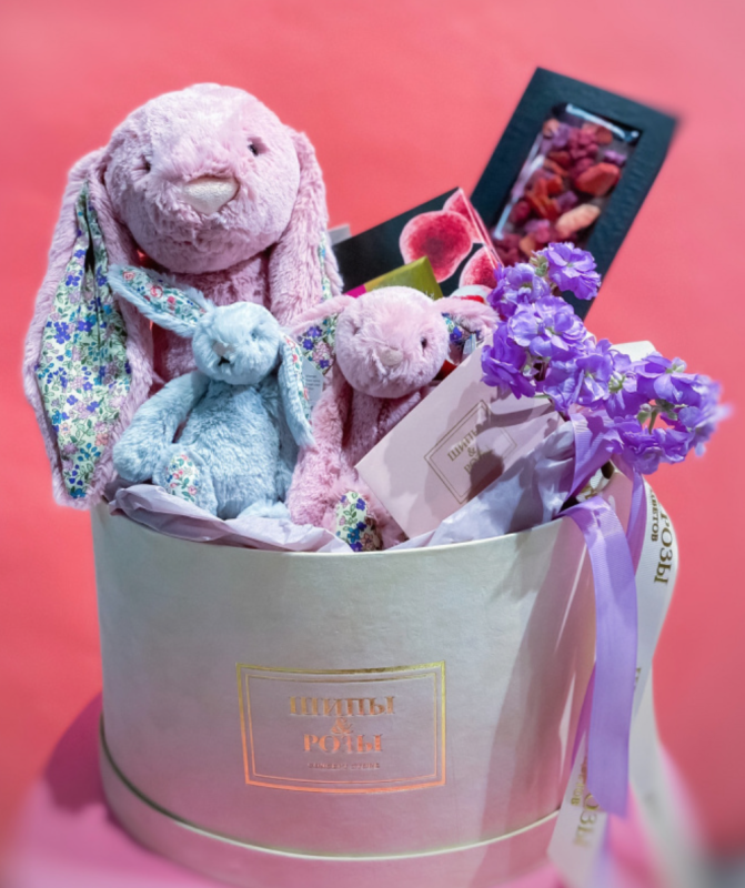 Состав подарочного набора: Мягкие игрушки, Цветы, Шоколад