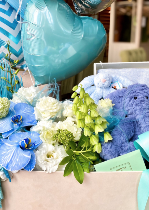 Состав подарочного набора: Мягкие игрушки, Цветы, Шоколад, Воздушные шары