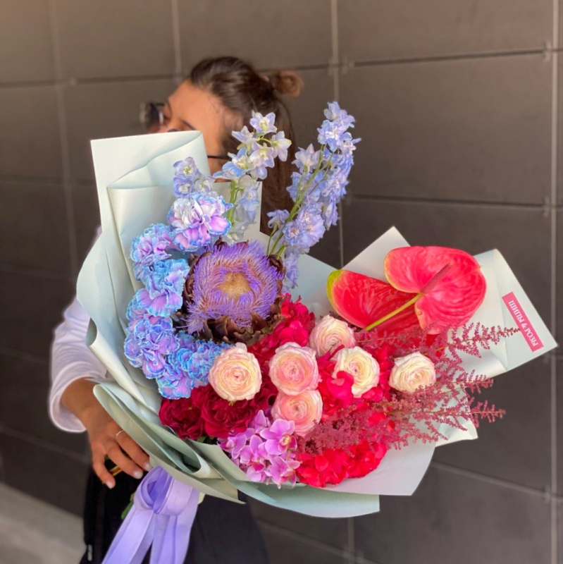 Состав букета: Астильба , Гвоздика, Роза, Антуриум , Протея ,Орхидея , Дельфиниум
