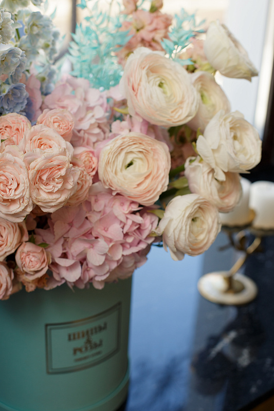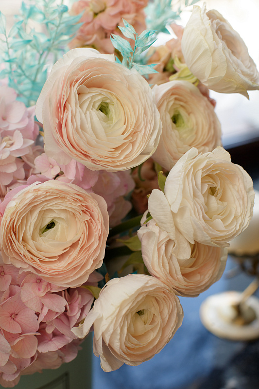 Состав букета: Гортензии, Пионовидные розы, Ранункулюсы
