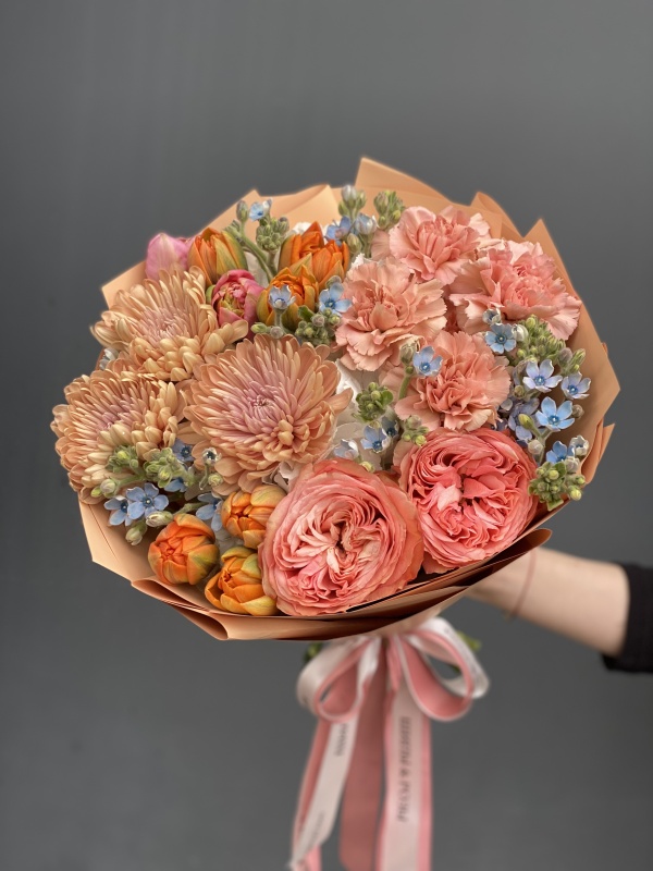 Наши флористы собирают уникальные букеты, учитывая ваши пожелания. В составе букетов присутствуют сезонные цветы, наличие которых зависит от времени года. При отсутствии каких-то цветов, мы предложим вам равноценную альтернативу, сохраняя гамму и стиль букета.