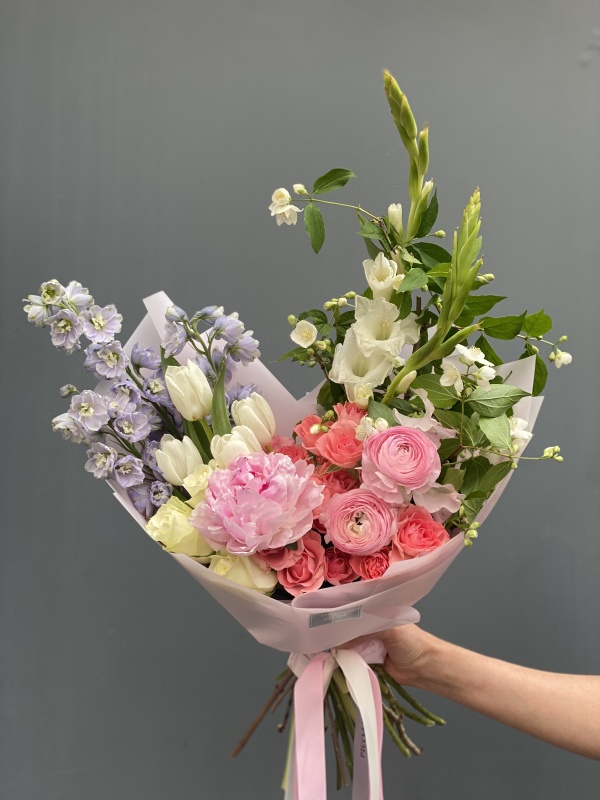 Весенний букет из тюльпанов, роз, пиона, дельфиниума.