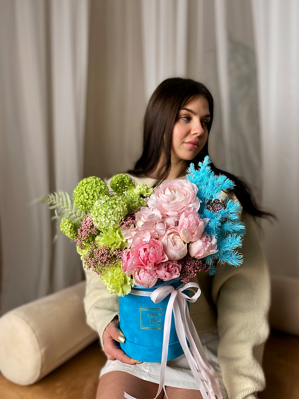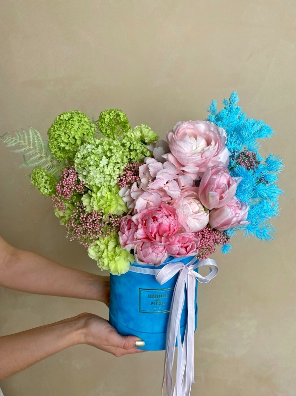 Состав композиции: ранункулюсы, тюльпаны, гвоздика, вибурнум, гортензия, сухоцветы.