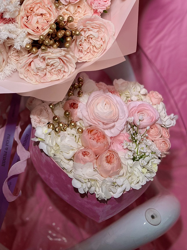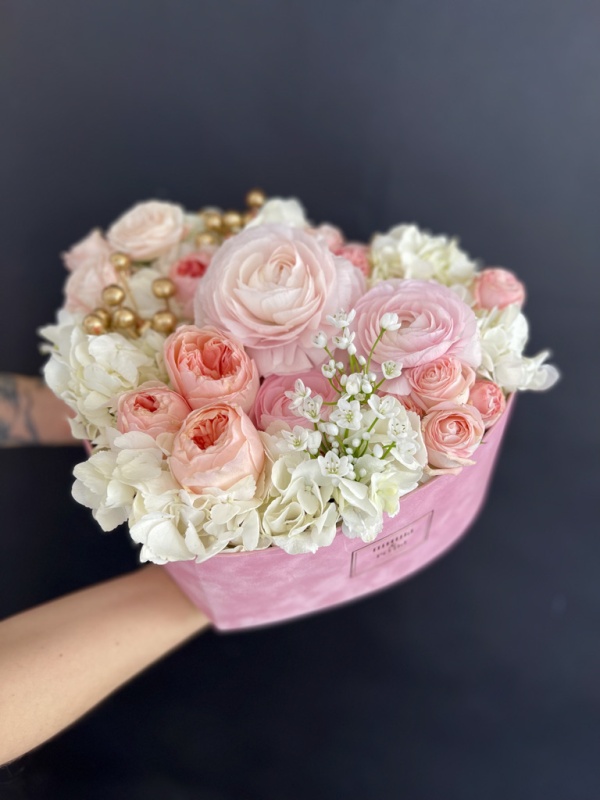 Состав композиции: Гортензия, Ранункулюсы, Пионовидные розы, Гиперикум, Аллиум