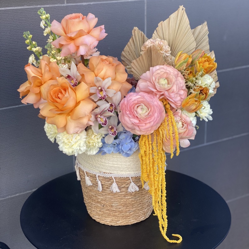 Состав букета: роза, ранункулюс, гвоздика, маттиола, тюльпан, орхидея