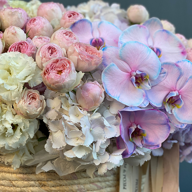Состав букета: Гортензия (Гидрангия), Эустома (Лизиантус), Роза кустовая, Фаленопсис (Орхидея)