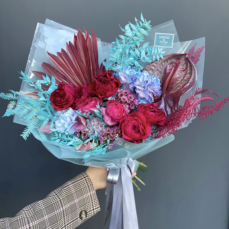Состав букета: Роза пионовидная, Гвоздика, Антуриум, Хамелациум, Сухоцветы