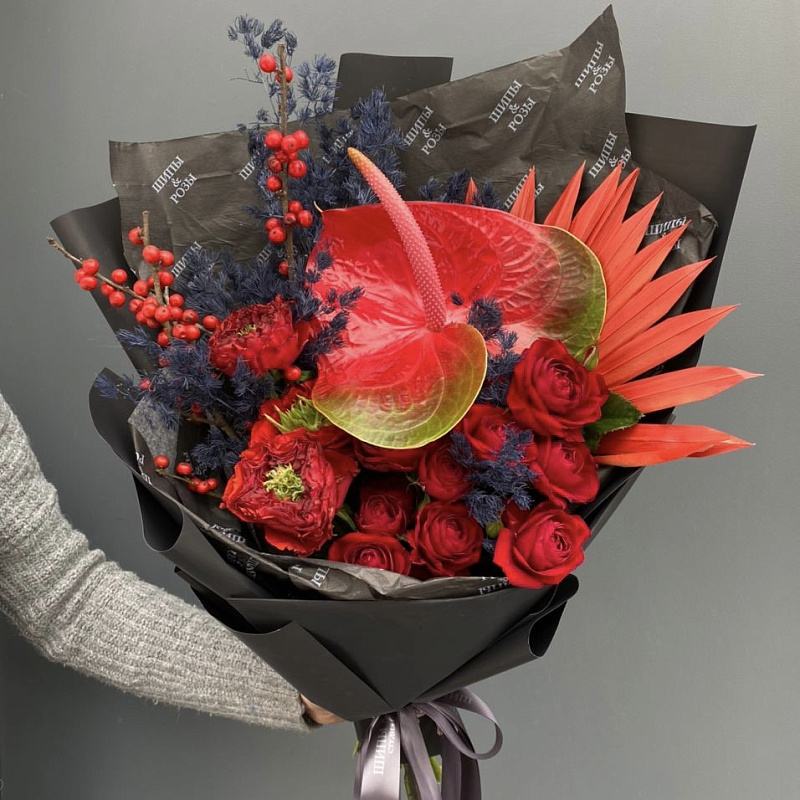 Состав букета: Антуриум, Роза пионовидная, Роза кустовая, Илекс, Сухоцветы