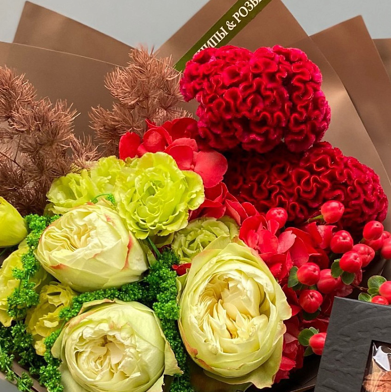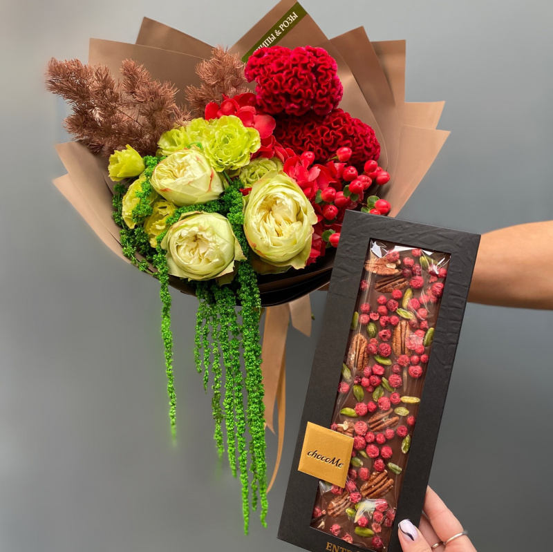 Этот красивый букет точно передает настроение и идеально сочетается с молочным шоколадом марки chocoMe. Красная целозия, фисташковая эустома и прекрасное дополнение в виде аспарагуса цвета шоколада. Порадуйте себя и своих близких! Мы всегда готовы вам в этом помочь!