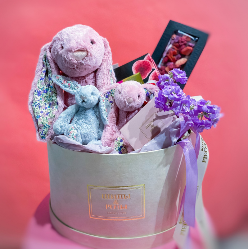 Состав подарочного набора: Мягкие игрушки, Цветы, Шоколад