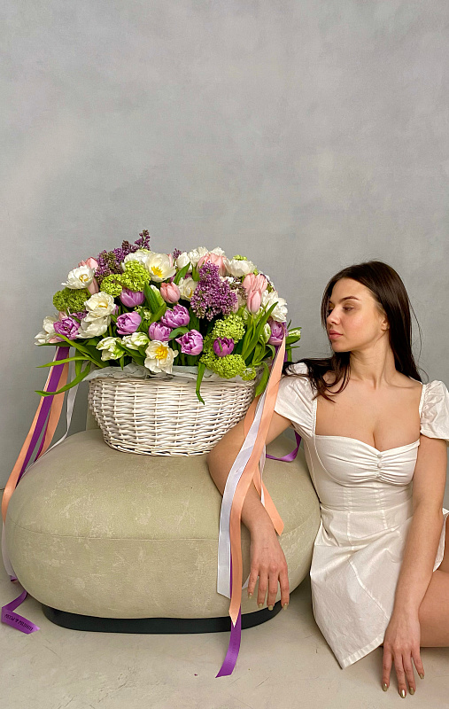 Состав композиции: Тюльпаны, Вибурнум, Сирень