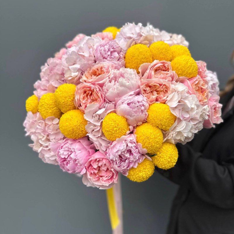 Состав букета: Гидрангия 6, хризантема 17, пион 6, Роза нотиинг Хилл 13.