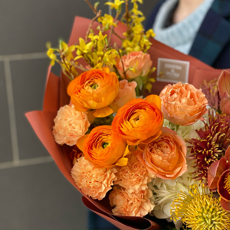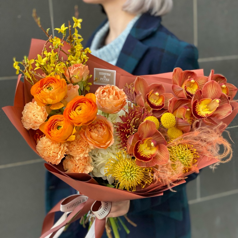 Состав букета: Гортензия (Гидрангия), Ранункулюс, Форзиция, Цимбидиум (Орхидея), Краспедия, Нутан, Роза кустовая, Сухоцветы