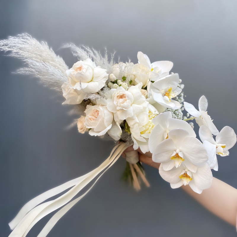 Свадебный букет из пионовидной розы, гиперикума, орхидеи и гипсофилы.