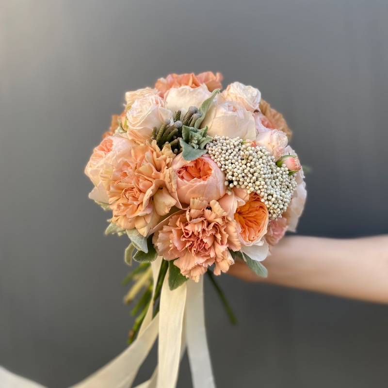 Свадебный букет из пионовидной розы Джульетта, карамельной гвоздики, озотамнуса и брунии. Прекрасно подчеркнет и дополнит деталями образ невесты!