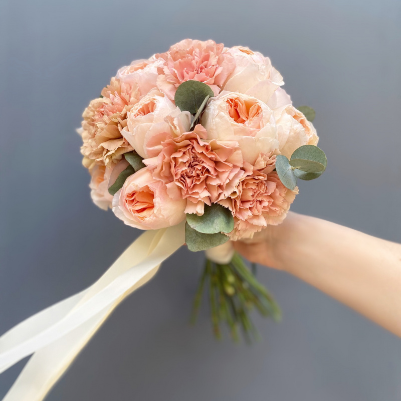 Свадебный букет из карамельно-бежевое облака пионовидной розы Джульетта в сочетании с гвоздиками. Прекрасно подчеркнет и дополнит деталями образ невесты!