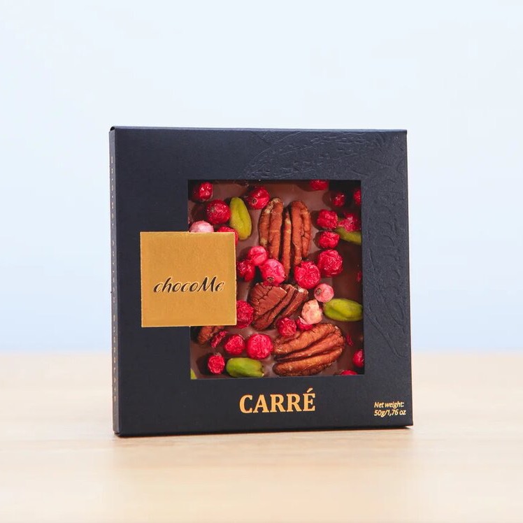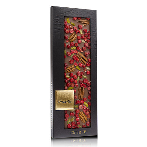 Молочный шоколад 43%, орехи пекан, кусочки сублимированной красной смородины, фисташки от Бронте