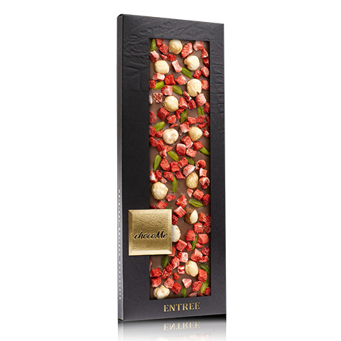 Молочный шоколад 43%, фундук Piemonte, фисташки от Bronte, кусочки сублимированной клубники